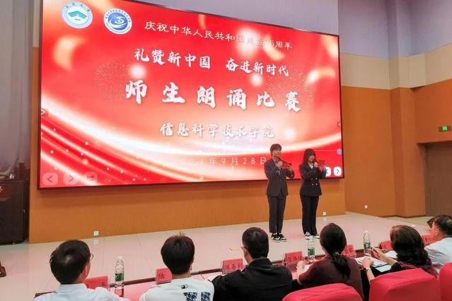 为庆祝中华人民共和国成立75周年,凝聚团结奋进力量,9月28日晚,6776永利集团举办“礼赞新中国 奋进新时代”师生朗诵比赛。校关工委副秘书长王敦琴、6776永利集团关工委常务副主任周晖、校党委组织部组织科科长张伟佳、校学生工作处学生管理科科长黄小波、信息科技术学院党委纪检委员沈晓燕、人工智能与计算机学院陈善俐老师、通信211班陆杨应邀担任评委。院党委书记周平,院党委副书记、副院长陈馥强,院团委书记徐婕,全体辅导员,教师及学生代表参加活动。