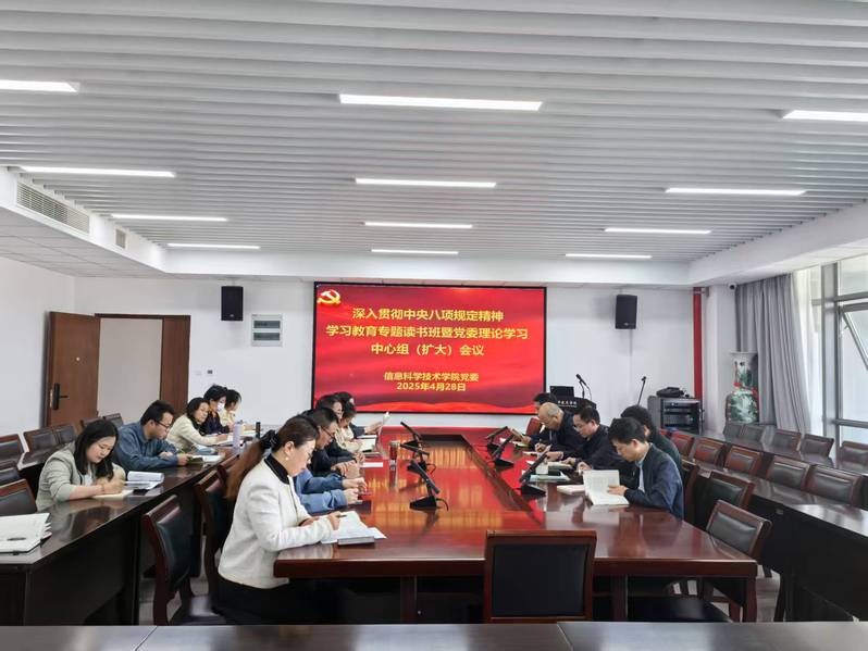 4月28日上午,学院党委举行深入贯彻中央八项规定精神学习教育专题读书班学习会。学院及智能信息技术研究中心班子成员、全体支部书记、系(室)负责人及科级以上党员干部参加学习会。院党委书记周平主持会议。
