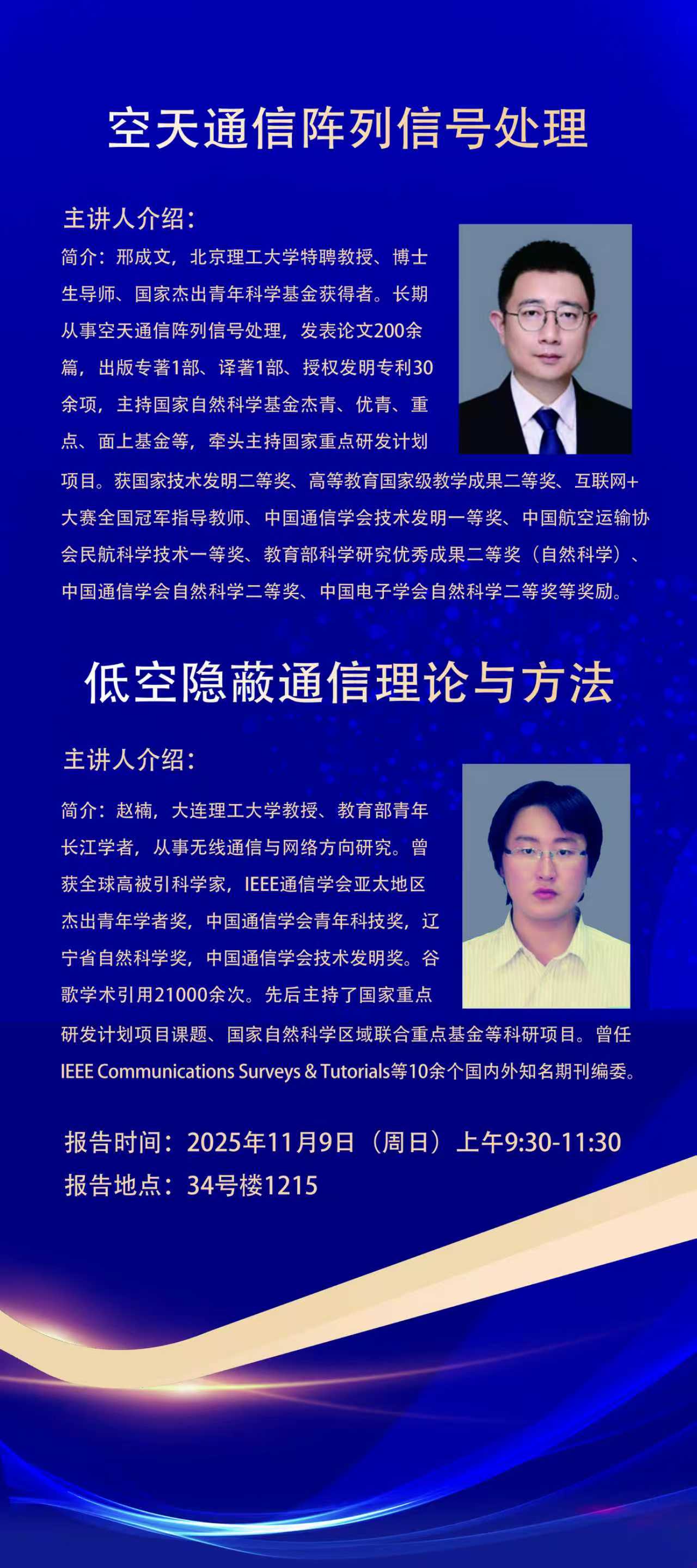 讲座预告:1、空天通信阵列信号处理;2、低空隐蔽通信理论与方法